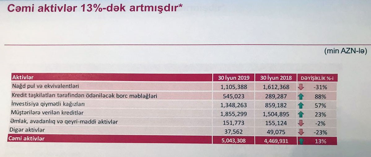 Bəhruz Nağıyev bildirdi ki, 30 İyun 2019-cu il tarixində “PAŞA Bank” qrupunun cəmi aktivləri 5 milyard 43 milyon manata çatıb. Aktivlər ötən ilin eyni dövrü ilə müqayisədə 13% artıb. Aktivlərdəki artımın əsas səbəbləri müştərilərə verilən kreditlərin 23% artaraq 1 milyard 855 milyon manata, qiymətli kağızlara investisiyaların isə 57% artaraq 1 milyard 348 milyon manata yüksəlməsidir. 30 İyun 208-ci il tarixində qiymətli kağızlara investisiyalar 859 milyon 182 min manat təşkil etmişdi. Qiymətli kağızlara investisiyaların təxminən 489 milyon manat artması diqqəti cəlb edir.