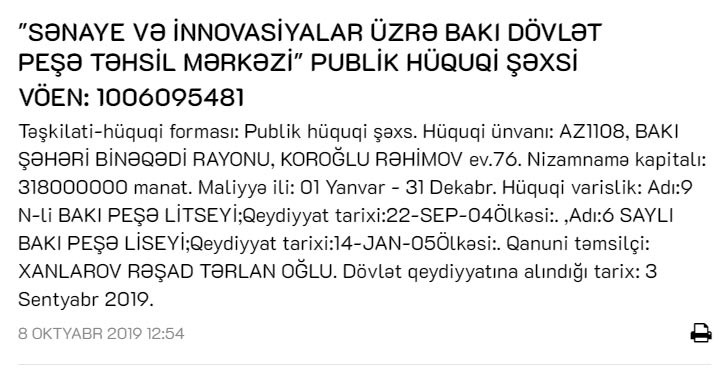 Vergilər Nazirliyi 04 Sentyabr 2019-cu il tarixində “Sənaye və İnnovasiyalar Üzrə Bakı Dövlət Peşə Təhsil Mərkəzi" publik hüquqi şəxsi dövlət qeydiyyatına alıb.