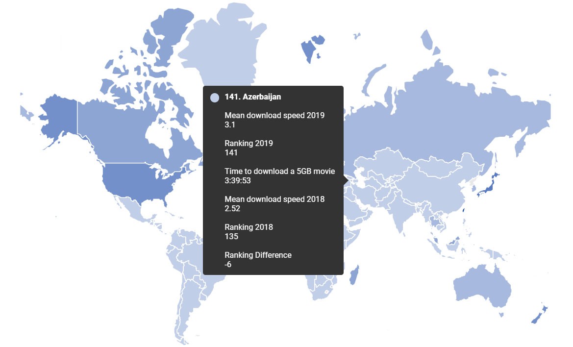 Hesabata görə, Azərbaycanda internetin orta yükləmə sürəti 3.1 Mbps-dir. Azərbaycandakı orta internet ilə 5 GB-lıq filmi endirmək üçün 3 saat 39 dəqiqə 53 saniyə tələb olunur.