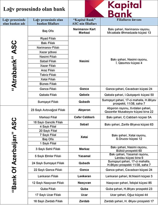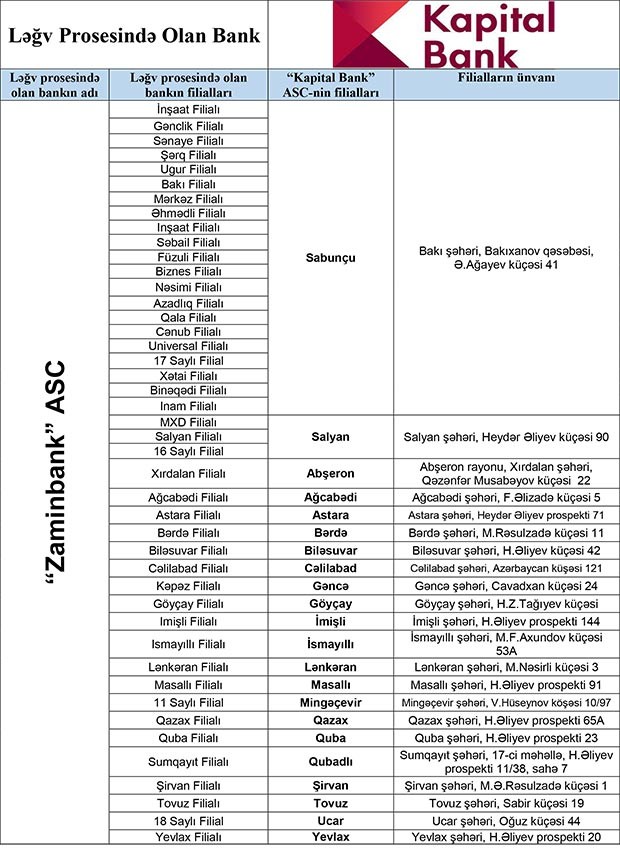 Ləğv prosesində olan banklarda kreditor tələbi olan fiziki şəxslərdən “Kapitalbank” ASC-nin aşağıda təqdim olunan siyahı üzrə filiallarına şəxsiyyətlərini təsdiq edən sənədlə müraciət olunması xahiş olunur.