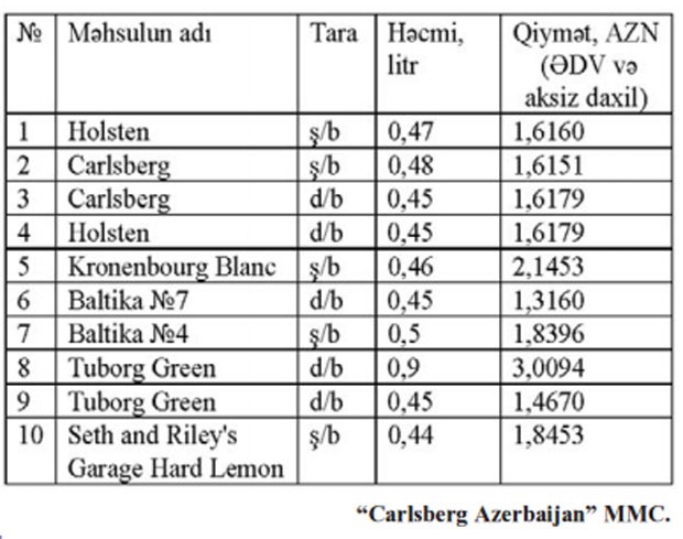 10 yeni məhsuldan ən baha qiymətə “Tuborg Green” məhsulu (3,094 manata), ən aşağı qiymətə isə “Baltika 7” məhsulu (1.32 manata) satılacaqdır.
