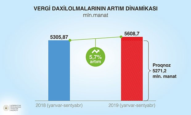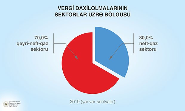 Vergilər Nazirliyi tərəfindən vergi daxilolmaları üzrə proqnoza 106,4 faiz əməl olunub, proqnoza nisbətən 337,5 milyon manat, əvvəlki ilin müvafiq dövrü ilə müqayisədə 5,7 faiz və ya 302,8 milyon manat məbləğində artıq vəsait daxil olub. Vergi daxilolmalarının 70,0 faizi qeyri-neft-qaz sektorunun, 30,0 faizi neft-qaz sektorunun payına düşüb. Cari ilin 9 ayında 2019-cu il üzrə illik vergi proqnozunun 76,7 faizi, o cümlədən qeyri-neft-qaz sektoru üzrə illik proqnozun 78,9 faizi icra olunub.