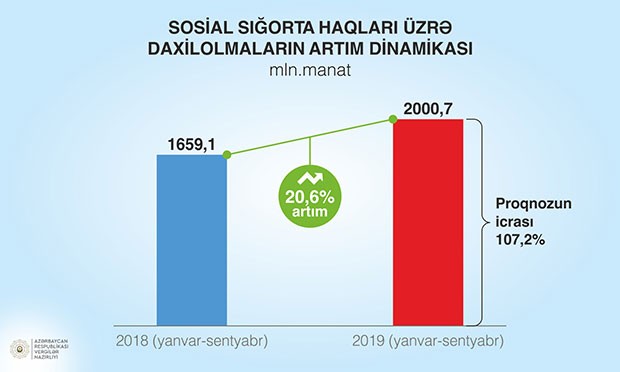 Bu şəraitdə sosial sığorta haqları üzrə daxilolmalar 20,6 faiz artıb, proqnoz 107,2 faiz icra edilib. Qeyri-büdcə təşkilatları üzrə daxilolmalar 21,9 faiz artıb, proqnoz 108,7 faiz icra edilib. İşsizlikdən sığorta haqları üzrə daxilolmalar 40,3 faiz artıb, proqnoz 107,3 faiz icra edilib. Qeyri-büdcə təşkilatları üzrə həmin daxilolmalar 44,8 faiz artıb, proqnoz isə 110,4 faiz icra edilib.