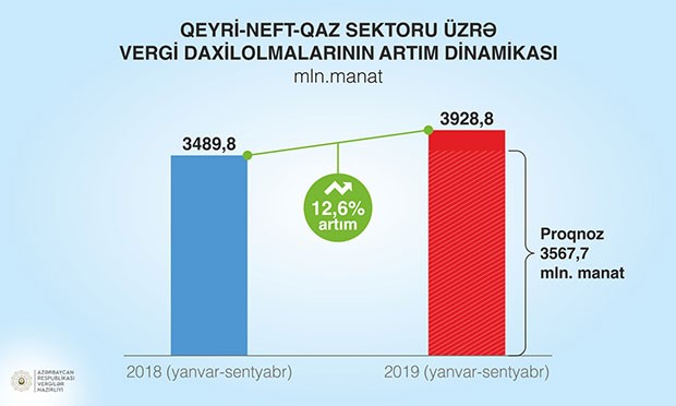 Qeyri-neft-qaz sektoru üzrə vergi daxilolmaları ötən ilin eyni dövrü ilə müqayisədə 12,6 faiz və ya 439 milyon manat artaraq 3 milyard 928,8 milyon manat təşkil edib. Qeyri-neft-qaz sektoru üzrə proqnoz 110,1 faiz icra olunub, proqnozdan əlavə 361,1 milyon manat vergi toplanıb.