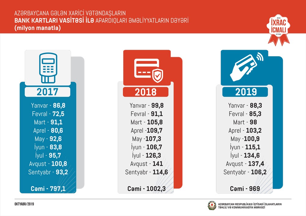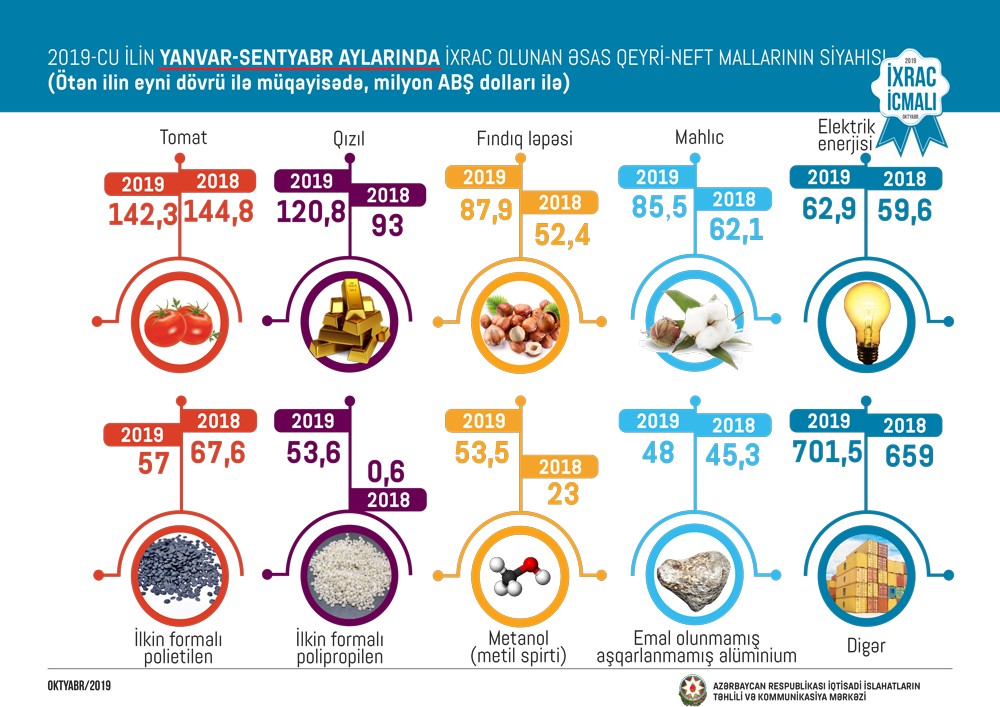 2018-ci ilin müvafiq dövrü ilə müqayisədə 2019-cu ilin 9 ayında Rusiyaya qeyri-neft ixracı 16 faiz, Türkiyəyə 10 faiz, İsveçrəyə 19 faiz, Gürcüstana 26 faiz və İtaliyaya 2,2 dəfə artıb.