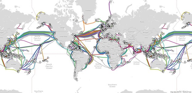 Mövcud okeanaltı magistral kabel xətlərinin əks olunduğu xəritə. Mənbə: Telegeography
