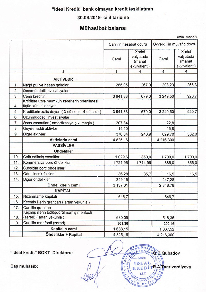 Sentyabr ayının sonunda “İdeal Kredit” 647 min manat nizamnamə, 1 milyon 688 min manat cəmi kapitala malik olub.