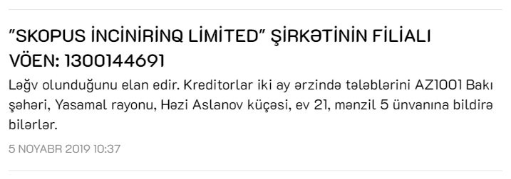 “Scopus Engineering Limited” (Sotlandiya) şirkəti bu gün Azərbaycanda fəaliyyətini dayandırdığını elan edib.
