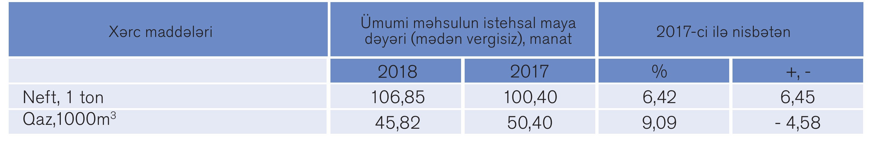 2018-ci ildə 1000 m3 qazın faktiki istehsal maya dəyəri 57,60 manat təşkil etmişdir ki, bu da keçən illə müqayisədə 4,59 manat və ya 7,4% azalmışdır.