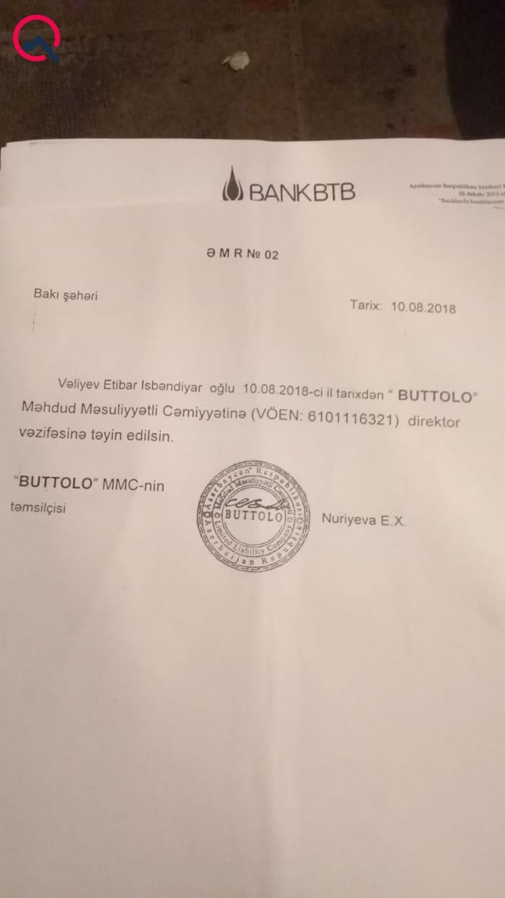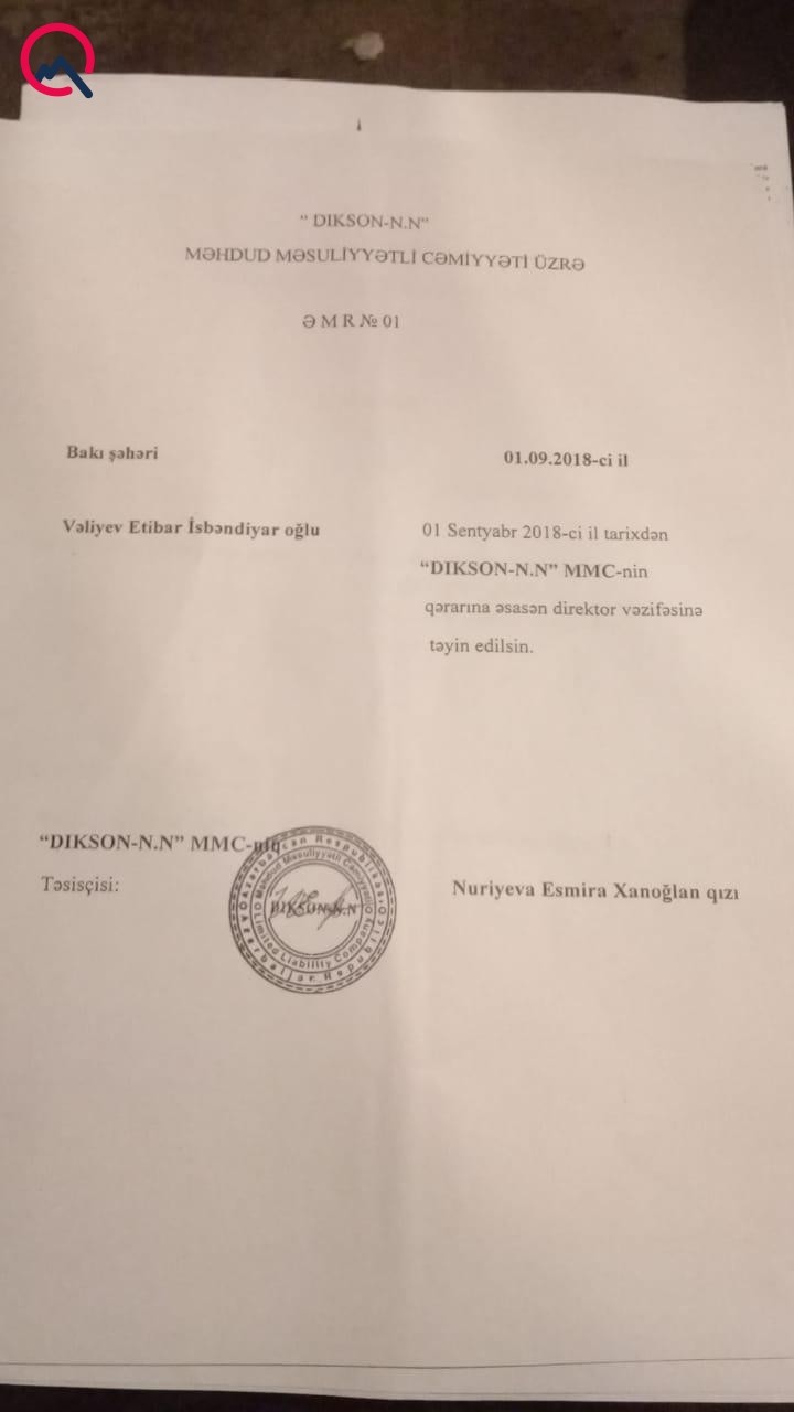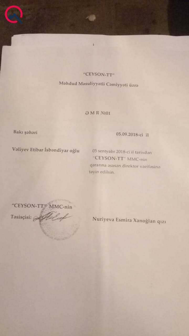 Şikayətçinin bizə təqdim etdiyi sənədlərdən görünür ki, onun adına açılan “Buttolo”, “Ceyson-TT”, “Dikson-N.N”, “Brayner – S.S”, “Lesnek-2018” şirkətinin hər birinə Vəliyev Etibar İsbəndiyar oğlu direktor təyin olunub.