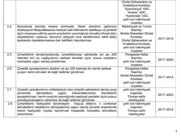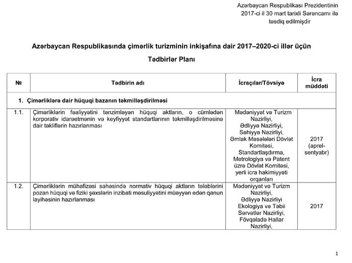 Azərbaycan Respublikası Prezidenti İlham Əliyev “Azərbaycan Respublikasında çimərlik turizminin inkişafına dair 2017–2020-ci illər üçün Tədbirlər Planı”nın təsdiq edilməsi haqqında Sərəncam imzalyıb.