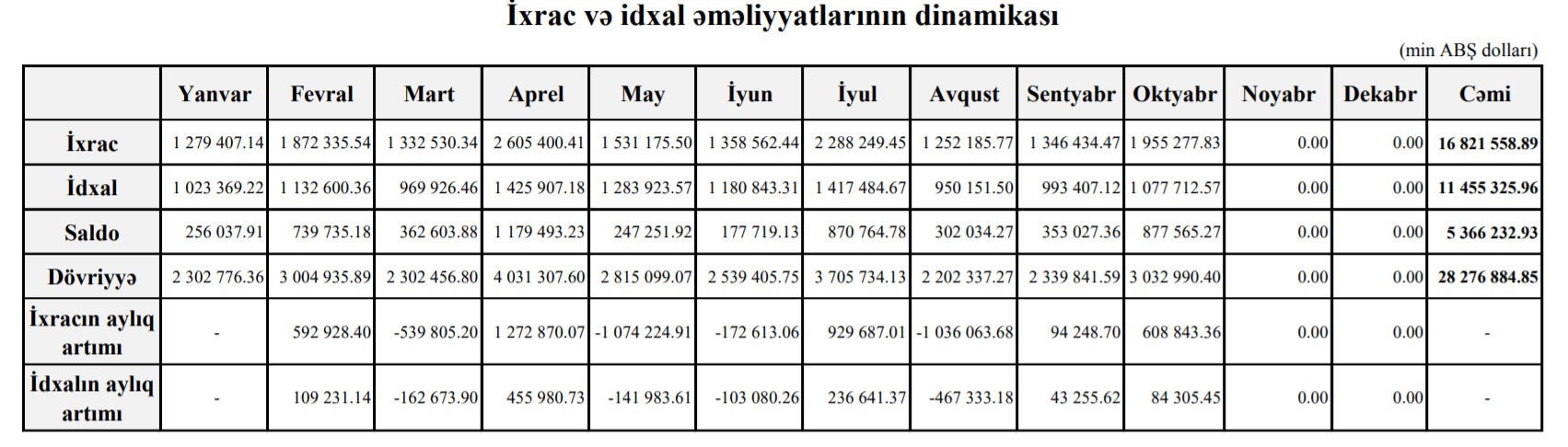 Oktyabr ayında ixrac 1 milyard 955 milyon 277 min dollar, idxal 1 milyard 77 milyon 71 min dollar, saldo isə 877 milyon 565 min dollar təşkil edib. Sentyabrda ixrac 1 milyard 346 milyon 434 min dollar, idxal 993 milyon 407 min dollar saldo 353 milyon 27 min dollar təşkil etmişdi.