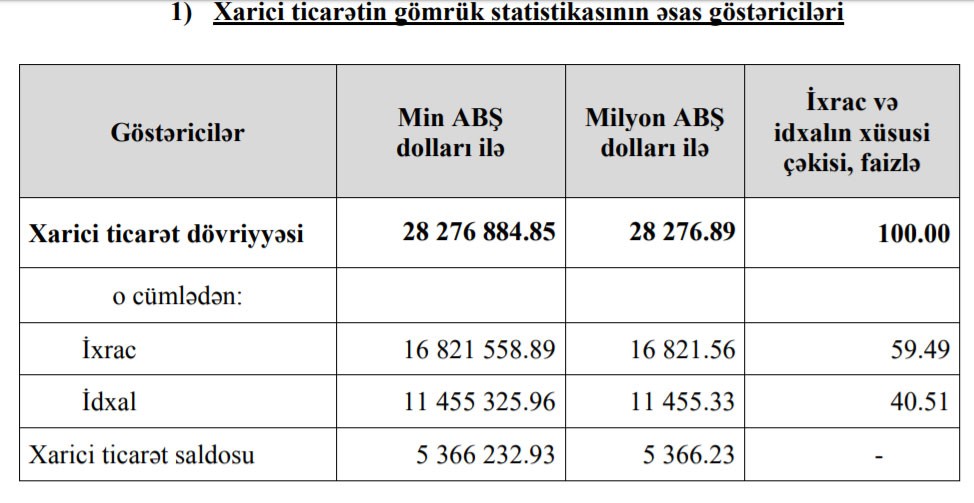 2019-cu ilin yanvar-oktyabr dövründə (10 ayda) Azərbaycanın xarici ticarət əməliyyatlarının cəmi məbləği 28 milyard 276 milyon 884 min dollar təşkil edib. Bu, ötən ilin eyni dövrü ilə müqayisədə 3 milyard 53 milyon dollar və ya 12,1% çoxdur.