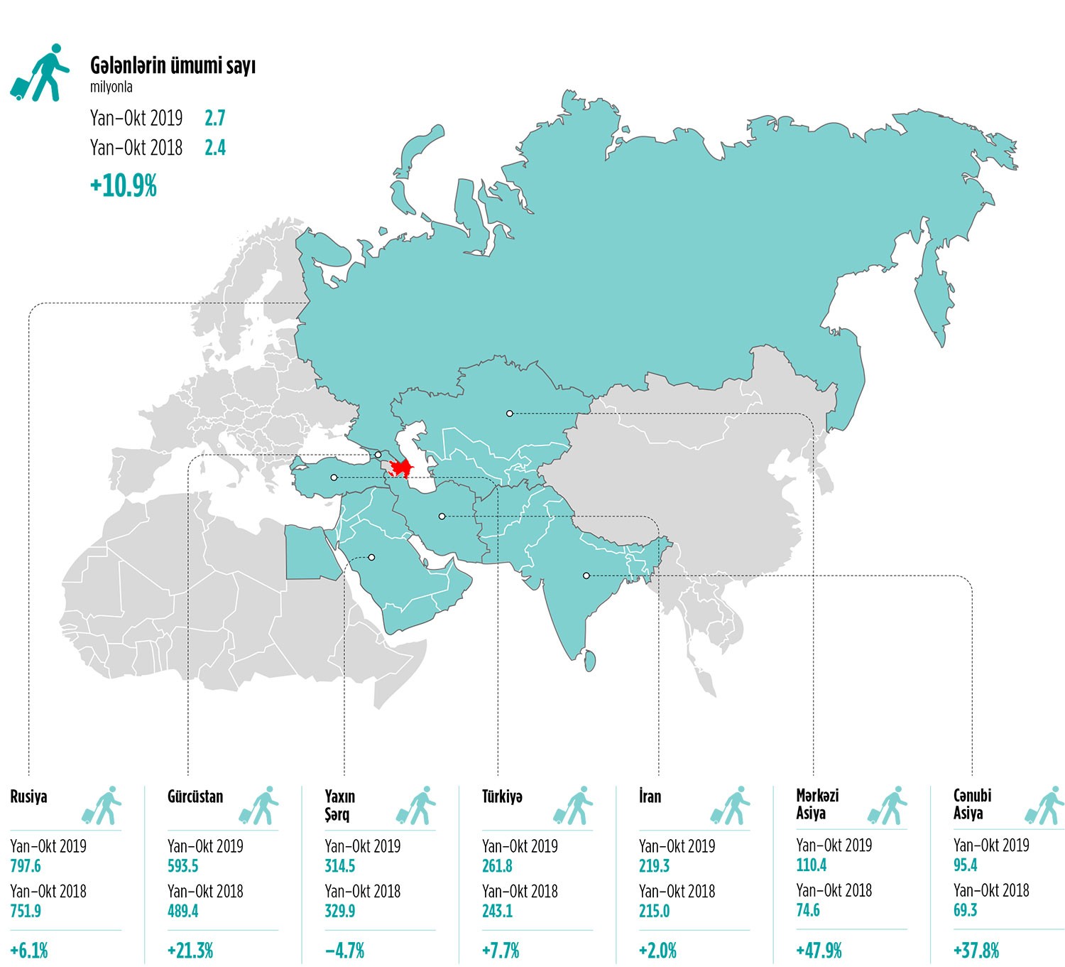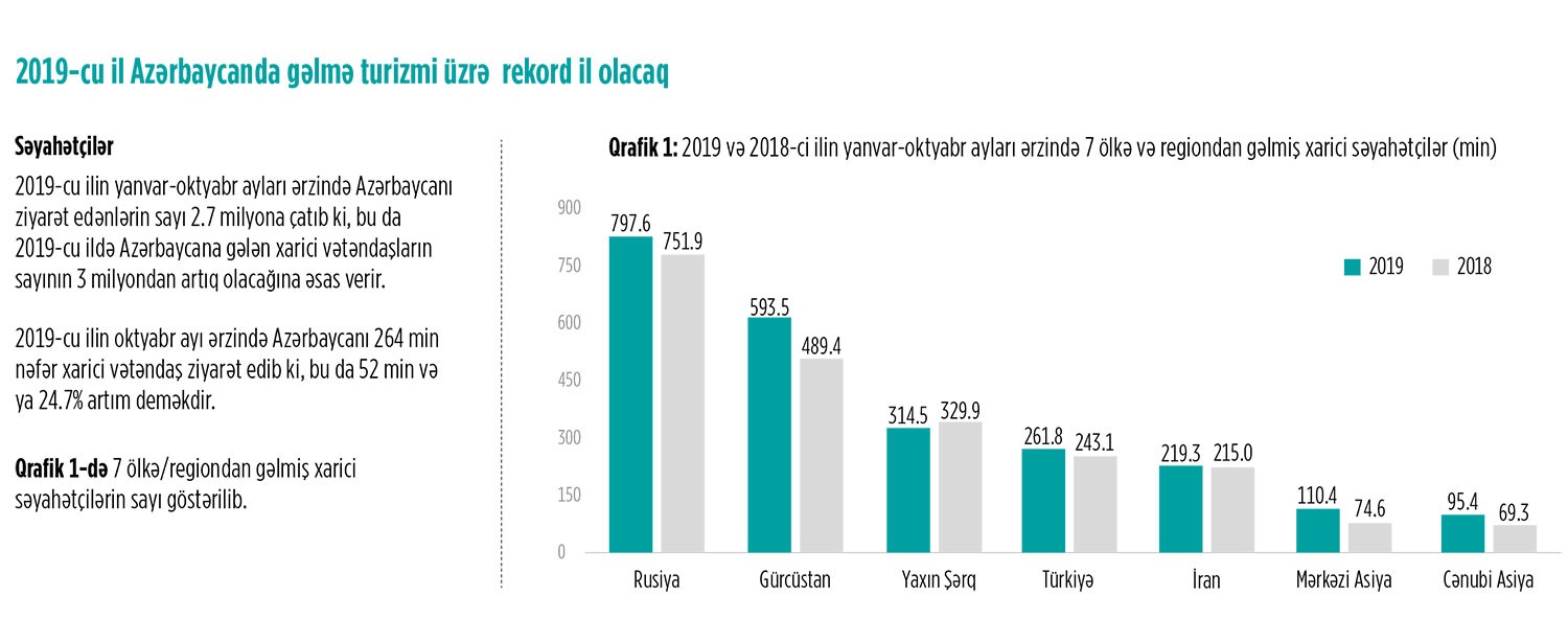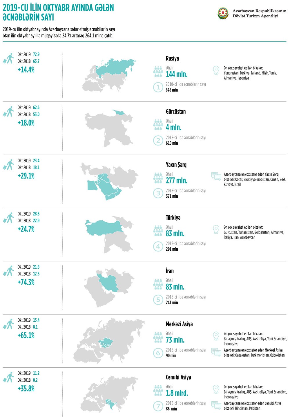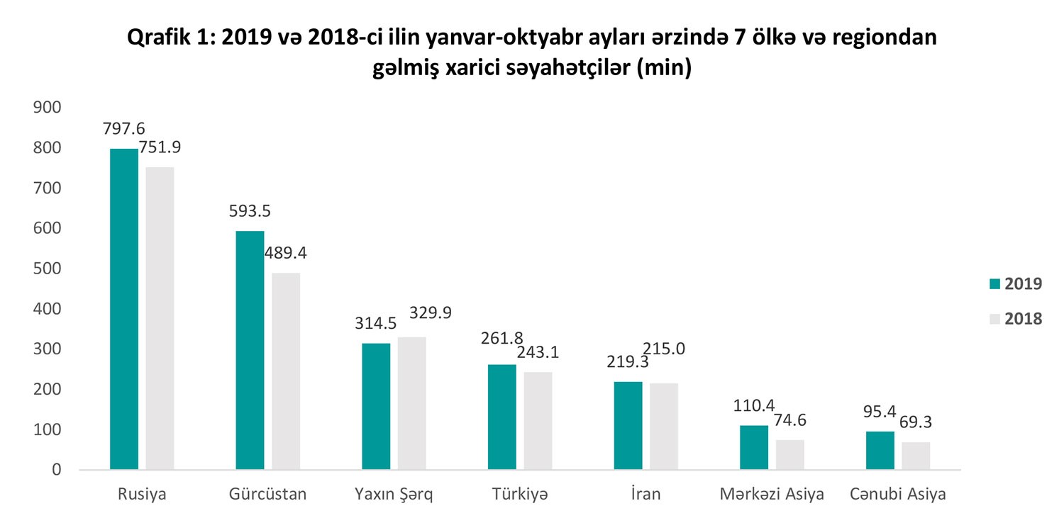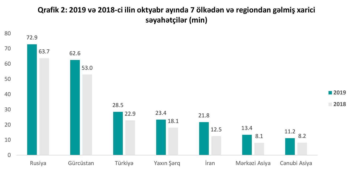 2019-cu ilin oktyabr ayı ərzində Azərbaycanı 264 min nəfər xarici vətəndaş ziyarət edib ki, bu da 52 min nəfər və ya 24.7% artım deməkdir. Ən yüksək artım 74.3%-lə İran və 65.1%-lə Orta Asiya ölkələri arasında qeydə alınıb. Mütləq sayda ən yüksək artım isə Gürcüstan (9.6 min nəfər və ya 18% artım) və Rusiyadan (9.2 min nəfər və ya 14.4% artım) gələnlər arasında müşahidə edilib. Mərkəzi Asiya ölkələrindən Türkmənistandan olan qonaqların sayı rekord 100.4% və ya 5.4 min nəfər artıb. Cənubi Asiya ölkələri arasında 41.7%-lə Hindistandan (cəmi 5.4 min nəfər), Yaxın Şərq ölkələri arasında isə 83.7%-lə Səudiyyə Ərəbistanından (cəmi 5.2 min nəfər) gələn qonaqlar arasında kəskin artım qeydə alınıb. Yaxın Şərq və Cənubi Asiyadan səyahət edənlərin sayı müvafiq olaraq 29.1% və 35.8% artaraq 23.4 min və 11.2 min nəfərə çatıb.