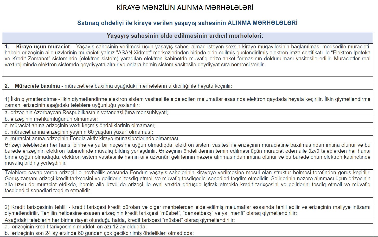 Əvvəlcədən müəyyən edilmiş şərtlərə və tələblərə uyğun olan vətəndaşla Fond arasında kirayə müqaviləsi bağlanılır və həmin kirayə müqaviləsi üzrə kirayəçi öz üzərinə düşən vəzifələri tam yerinə yetirərsə, kirayə qaldığı yaşayış sahəsi yekunda müfaviq sənədləşmə işləri aparılmaqla kirayəçinin mülkiyyətinə keçir.