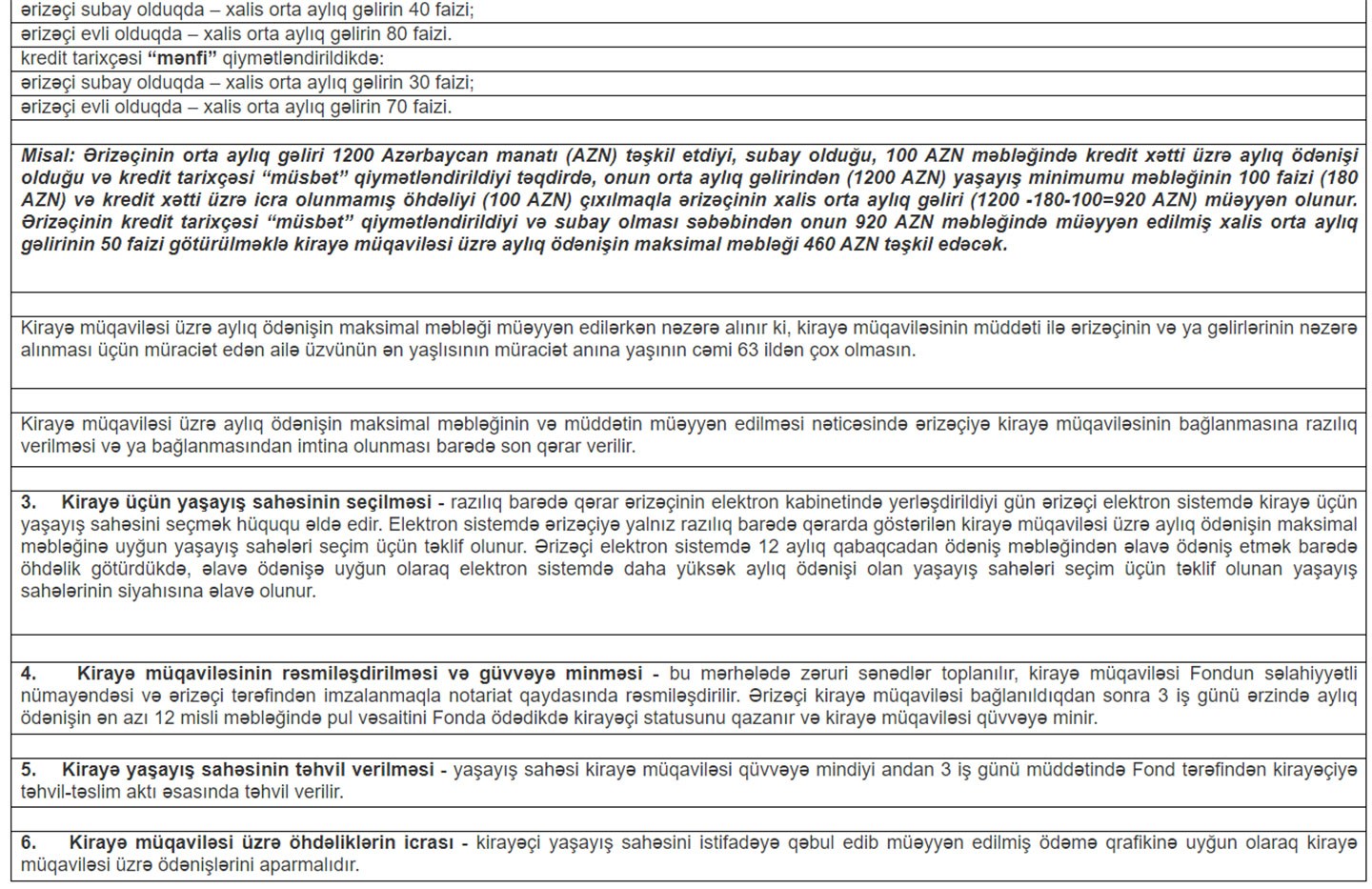 Fondun şərtlərinə və tələblərinə əsasən Sizin kirayə müqaviləsi üzrə aylıq ödənişlərinizin maksimal məbləği kredit tarixçənizin, gəlirlərinizin və xərclərinizin təhlili əsasında müəyyən edilir (müsbət, qənaətbəxş və mənfi kredit tarixçəsi ola bilər). Gəlirlər və xərclər arasında hesablanan fərq nəticəsində yaranan xalis gəlirin məbləğinin əvvəlcədən müəyyən olunmuş faizi nisbətində (müxtəlif kateqoriyalı vətəndaşlar üçün fərqlidir) aylıq ödənişin maksimal məbləği müəyyən edilir və buna uyğun olaraq Sizə müvafiq alış qiyməti ilə yaşayış sahəsini seçmək imkanı verilir. Fond tərəfindən yaşayış sahələrinin kirayə verilməsinin ilk vaxtlarında, vacib infrastruktur obyektlərinə yaxın, sakinlərin istirahət etməsi üçün ümumi həyətyanı sahəsi olan, ekonom tipli yaşayış sahələri seçim üçün təqdim ediləcək.
