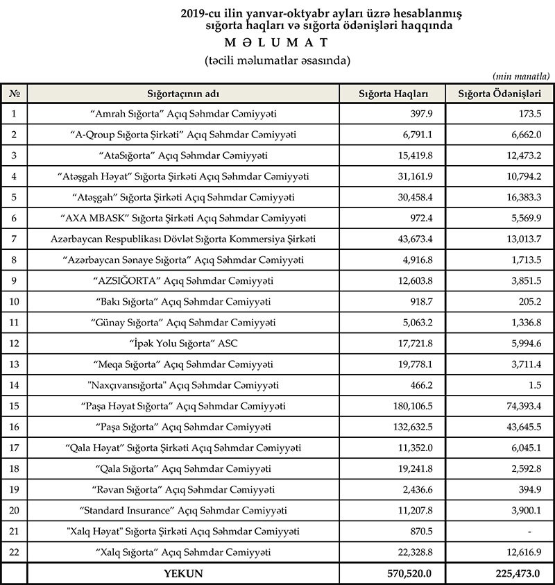 Maliyyə Bazarlarına Nəzarət Palatasının yaydığı məlumata görə, 2019-cu ilin yanvar-oktyabr aylarında ölkədə fəaliyyət göstərən sığorta şirkətləri tərəfindən 570.5 milyon manat məbləğində sığorta haqqı toplanıb, 225.5 milyon manat məbləğində sığorta ödənişi həyata keçirilib.