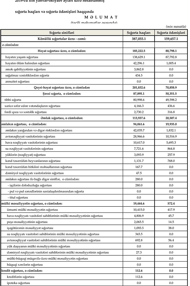 2019-cu ilin yanvar-oktyabr aylarında könüllü sığorta bazarı üzrə haqlar 387 milyon manat, ödənişlər isə 159.7 milyon manat təşkil edib. İcbari sığorta bazarı üzrə haqlar 183.5 milyon manat, ödənişlər isə 65.8 milyon manat olub.