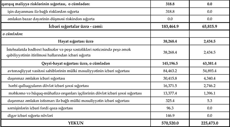 Vergi sahəsində aparılmış islahatlar nəticəsində daha öncə təklif edilən vergi güzəştlərinin və həyatın yaşam sığortasına yönəldilən vəsait üzrə limitin azaldılması ilə əlaqədar ümumilikdə həyat sığortasında azalma olsa da, sosial-iqtisadi əhəmiyyət daşıyan növlərdən olan istehsalatda bədbəxt hadisə və peşə xəstəlikləri nəticəsində peşə əmək qabiliyyətinin itirilməsi hallarından icbari sığorta üzrə 27% (8 milyon manat) artım olub.