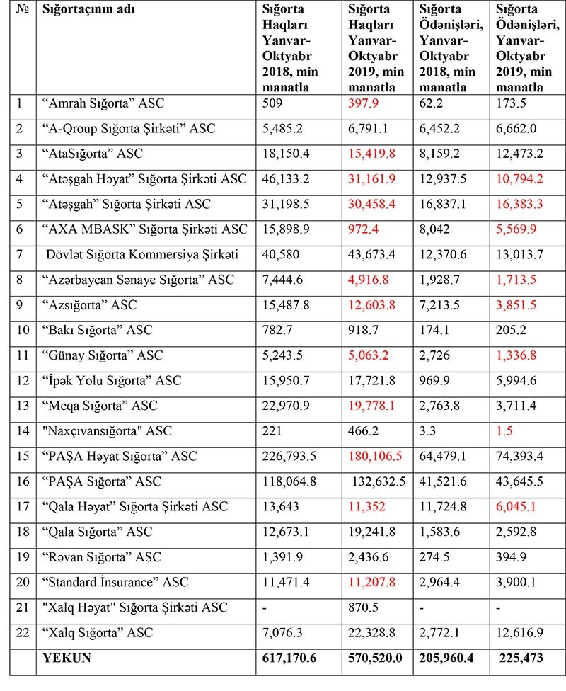 2018-ci ilin yanvar-oktyabr dövrü ilə müqayisədə 2019-cu ilin yanvar-oktyabr dövründə Azərbaycanın 22 sığorta şirkətindən 12-sinin topladığı sığorta haqları azalıb.
