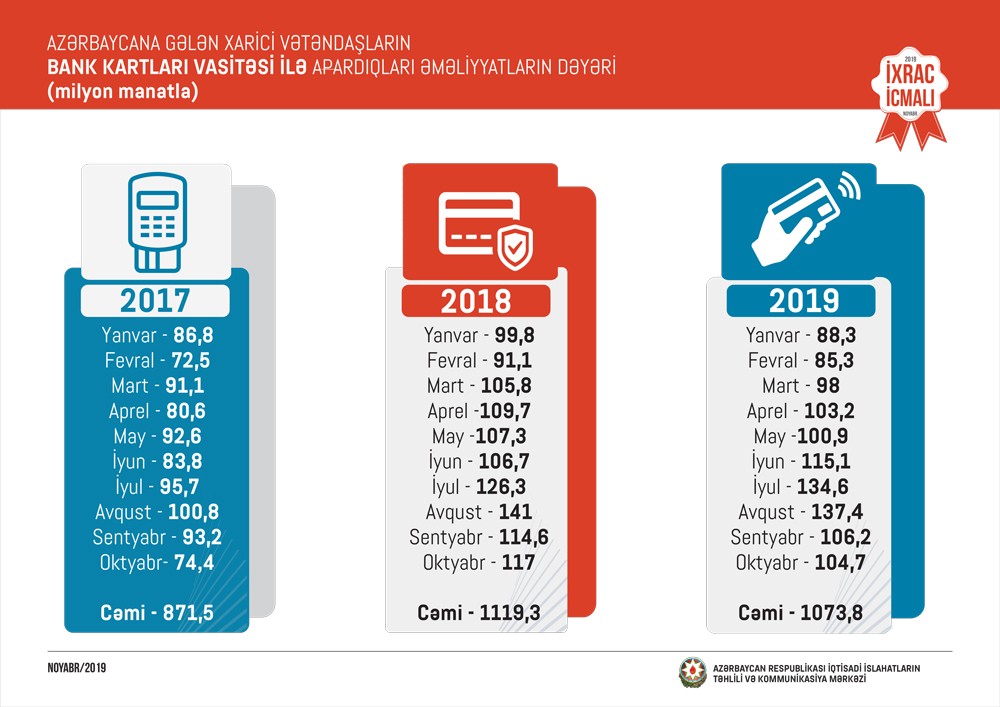 “İxrac İcmalı”nda məlumat verilib ki, 2019-cu ilin yanvar-oktyabr aylarında Azərbaycana dünyanın 192 ölkəsindən 2,7 milyon və ya 2018-ci ilin yanvar-oktyabr ayları ilə müqayisədə 10,8 faiz çox əcnəbi və vətəndaşlığı olmayan şəxs gəlib. Bu ilin oktyabr ayında ölkəmizə gələn xarici vətəndaşların sayı 24,7 faiz artıb və onların bank kartları vasitəsi ilə apardıqları əməliyyatları 104,7 milyon manat təşkil edib. Ümumilikdə isə 2019-cu ilin yanvar-oktyabr ayları ərzində Azərbaycana gələn xarici vətəndaşların bank kartları vasitəsi ilə apardıqları əməliyyatların dəyəri 1 milyard 74 milyon manat təşkil edib.