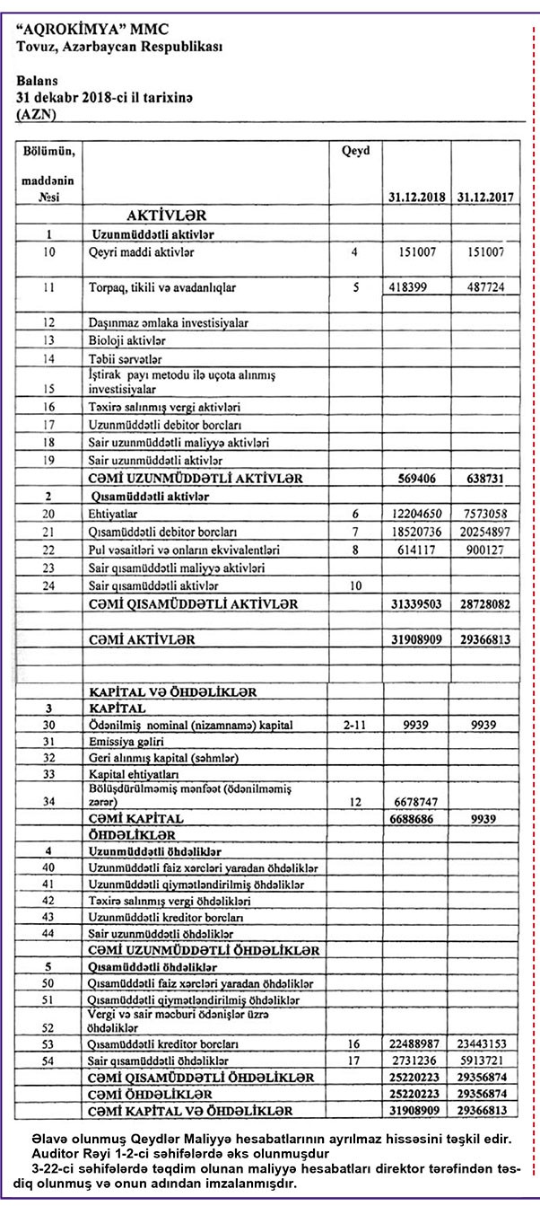 Bitki mühafizəsi vasitələri, pestisidlər, gübrələr, toxumlar, mikroelementlər və s. kənd təsərrüfatı təyinatlı malların idxalı ilə məşğul olan “Aqrokimya” MMC maliyyə hesabatlarını yarımçıq dərc etdirib. Şirkət balans hesabatını ictimaiyyətə açıqlasa da digər hesabatlarını, o cümlədən mənfəət və zərər hesabatını gizlədib.