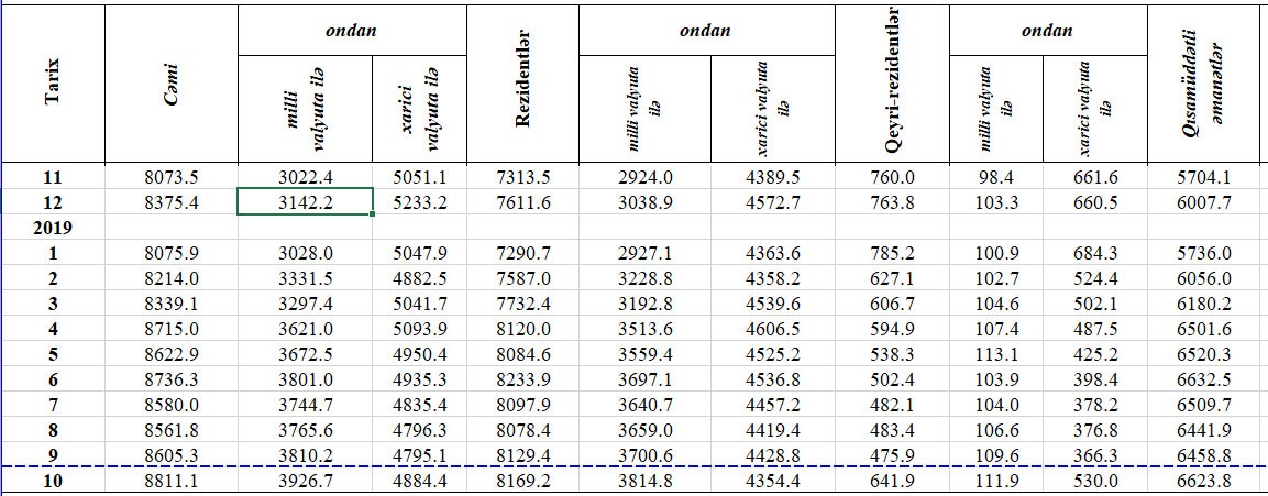 2019-cu ilin Oktyabr ayının sonundakı 8 milyard 811,1 milyon manat cəmi əmanətlərin 6 milyard 623.8 milyon manatını və ya 75,2%-ni qısamüddətli (1 ilədək), 2 milyard 187.3 milyon manatını və ya 24,8%-ni uzunmüddətli əmanətlər təşkil edib.