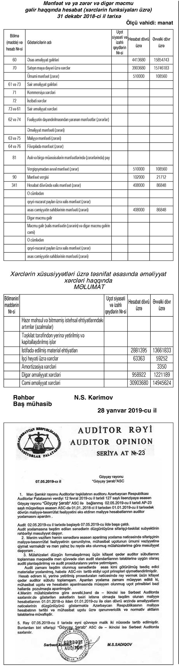 “Göyçay Şərab” ASC 2018-ci ili 408 min manat xalis mənfəət ilə başa vurub. 2017-ci illə müqayisədə şirkətin xalis mənfəəti təxminən 4,7 dəfə artıb. ASC 2017-ci ili 86 min 848 manat xalis mənfəət ilə bağlamışdı. Mənfəətin artması “Göyçay Şərab”ın satışlarının artmasından deyil, xərclərinin kəskin azalmasından qaynaqlanıb.