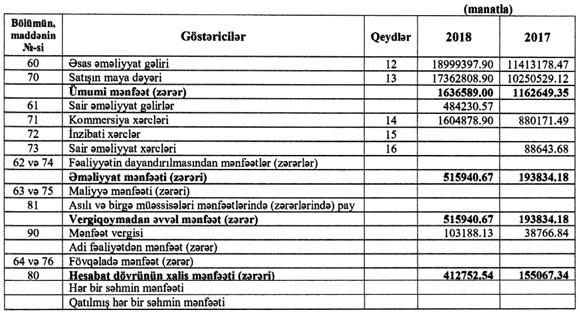 “Marja” şirkətin illik hesabatına istinadən xəbər verir ki, 2017-ci ildə 11 milyon 413 min manat təşkil etmiş əsas əməliyyat gəliri (satışdan gəliri) 2018-ci ildə 18 milyon 999 min manata yüksəlib (7 milyon 586 min manat və ya 66,5% artıb). Müqayisə olunan dövrdə satışın maya dəyəri isə 10 milyon 251 min manatdan 17 milyon 363 min manata qalxıb.