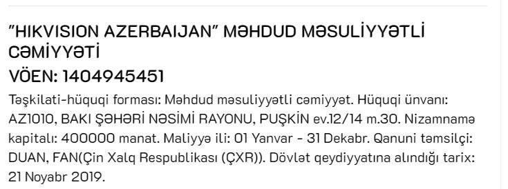 Kamera bazarında ən böyük şirkətlərdən biri olan Çinin "Hikvision" şirkətinin adı ilə Azərbaycanda şirkət dövlət qeydiyyatına alınıb.