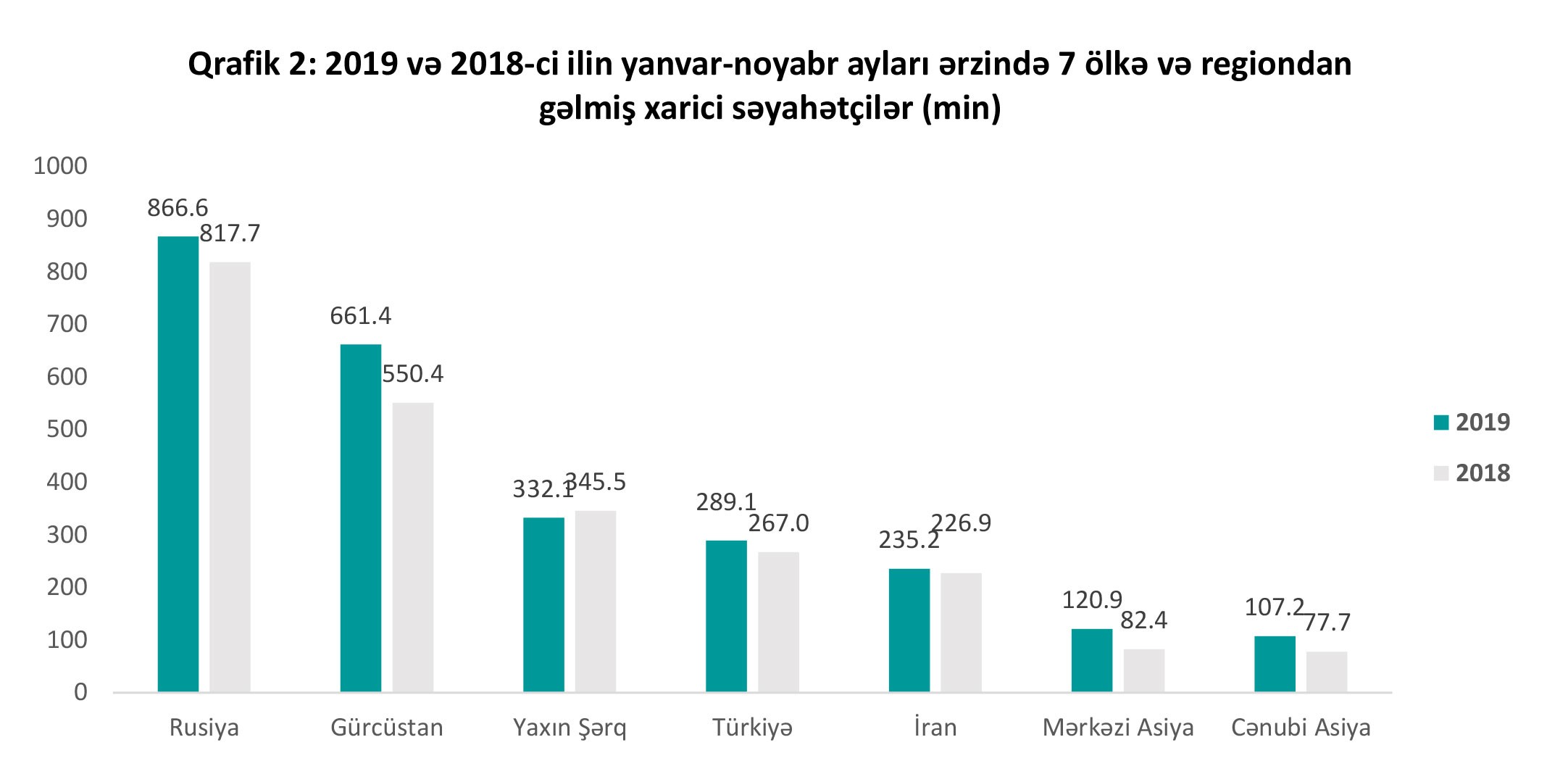 2019-cu ilin yanvar-noyabr aylarında Azərbaycana səfər etmiş xarici vətəndaşların sayı 2018-ci ilin eyni dövrü ilə müqayisədə 11.1% və ya 292 min nəfər artıb. Bu artım da 2017-ci ildən 2018-ci ilə olan artımdan 6%, təqribən iki dəfə çoxdur. Xarici ölkələrdən gələnlərin üçdə birini Rusiya vətəndaşları təşkil edib. Belə ki, 2018-ci ilin yanvar-noyabr ayları ilə müqayisədə Rusiyadan gələnlərin sayı 49 min və ya 6% artaraq 866 min nəfər olub. Ən yüksək artım müvafiq olaraq 20.2%, 46.7% və 38% daha çox Gürcüstan, Mərkəzi və Cənubi Asiya ölkələrindən müşahidə edilib.