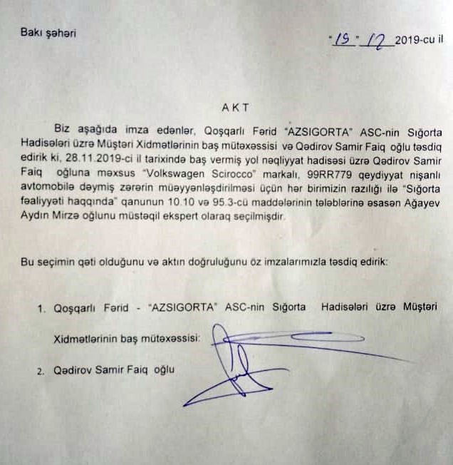 “Müstəqil ekspertizanı “Azsığorta” ilə razılaşdırmışam. Müstəqil ekspert “Azsığorta”nın təqdim etdiyi siyahı əsasında, şirkətin ofisində seçilib. Ekspertizaya “Azsığorta”nın aktı ilə müraciət etmişəm”.
