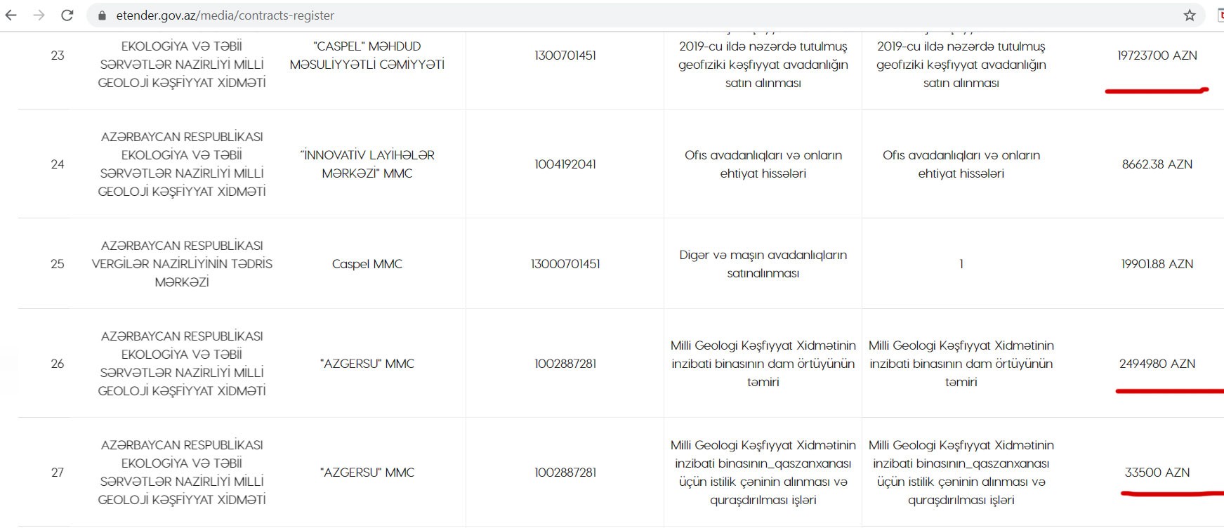 Həmçinin Milli Geoloji Kəşfiyyat Xidməti “SİM-KO ” MMC ilə də müqavilə bağlayıb. Məbləği 2 milyon 367 min manat olan müqavilə “Milli Geoloji Kəşfiyyat Xidmətinin inzibati binasında istilik sisteminin və kanalizasiya xətlərinin çəkilməsi”ni nəzərdə tutur.