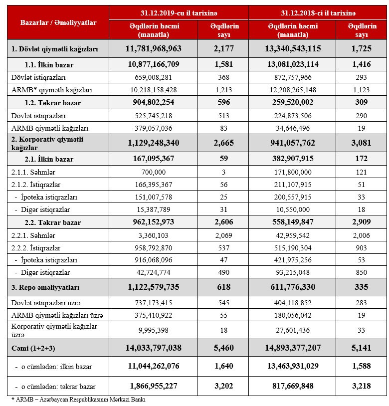 “2019-cu il üzrə dövlət qiymətli kağızların ilkin bazarında yerləşdirmələrin həcmində ötən ilə nəzərən azalma müşahidə olumasına baxmayaraq, korporativ qiymətli kağızlar üzrə yerləşdirmələrin həcmində 20% artım qeydə alınmışdır.