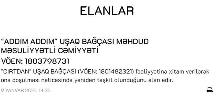 “Marja” xəbər verir ki, “Cırtdan” uşaq bağçasının fəaliyyətinə xitam verilərək “Addım Addım” Uşaq Bağçası MMC-yə qoşulur.