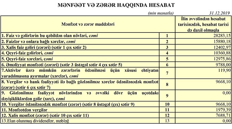 2018-ci ildə Bankın 24 milyon 888 min manat təşkil etmiş faiz gəlirləri 2019-cu ildə 28 milyon 283 min manata, qeyri-faiz gəlirləri isə 2 milyon 698 min manat ikən, 2019-cu ildə 10 milyon 360 min manata yüksəlib.
