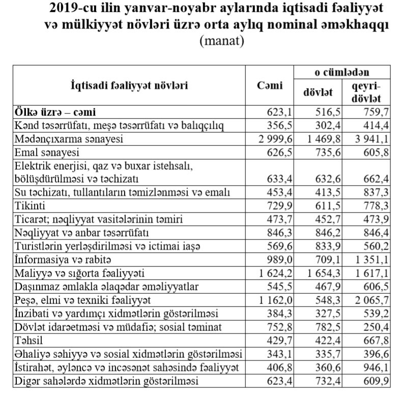 Qeyd edilib ki, əməkhaqqı neft-qaz sektorunda 3059,7 manat, qeyri neft-qaz sektorunda 568 manat təşkil etmişdir.