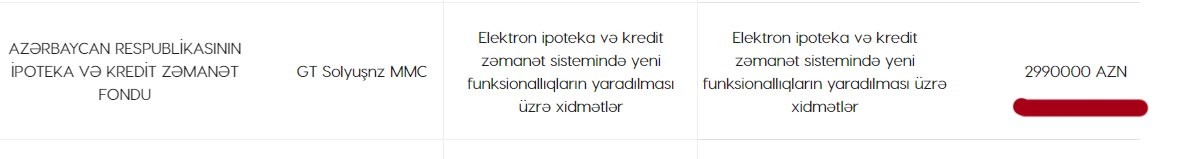 Fond 2018-ci ildə isə Elektron ipoteka və kredit zəmanət sistemində yeni funksionallıqların yaradılması üçün “GT Solyuşnz” MMC şirkətilə 2 milyon 990 min manatlıq müqavilə bağlayıb və bu vəsaiti adı çəkilən şirkətə ödəyib.