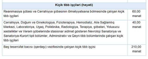 Agentlikdən verilən məlumata görə, qaydaya əsasən tibb işçisinin əmək haqqına tutduğu vəzifədən, stajından və xidməti fəaliyyətinin qiymətləndirilməsindən asılı olaraq müəyyən edilən vəzifə (tarif) maaşı, əmək şəraitinə görə ödənilən əlavələr, həvəsləndirici əlavələr və Əmək Məcəlləsində nəzərdə tutulmuş digər ödənişlər daxildir.