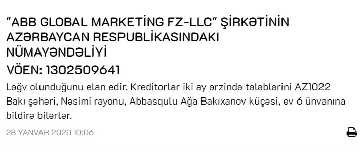 Müraciətdə deyilirdi ki, kreditorlar tələblərini Nizami küçəsi ev 90A, Landmark ofis plaza 12-ci mərtəbədəki ünvana bildirə bilərlər.