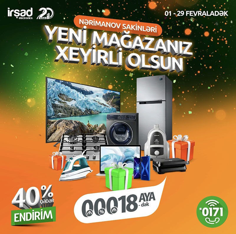 (®) İrşad Elektronics mağazalarının açılışını gözləyənlər bu dəfə iki ünvanı yadda saxlamalı olacaqlar. Bakıda Ağa Nemətulla küçəsi, 42 ünvanında yerləşən “Nərimanov” mağazasının fevralın 1-də və Akademik Mirqasımov küçəsi, 10 ilə Azadlıq prospekti, 103 ünvanının kəsişməsində yerləşən “Azadlıq Rezidence” mağazasının isə fevralın 2-də rəsmi açılışı olacaq.