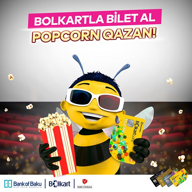 Park Cinema kinoteatrlarında bilet alan Bolkart Gənc debet və ya taksit kart sahiblərinə aldıqları hər bir biletə görə 1 ədəd popcorn HƏDİYYƏ olunacaq. 01 – 02 fevral tarixlərində keçərli olan kampaniya pos-terminal vasitəsilə edilən ödənişlərə şamil olunur.