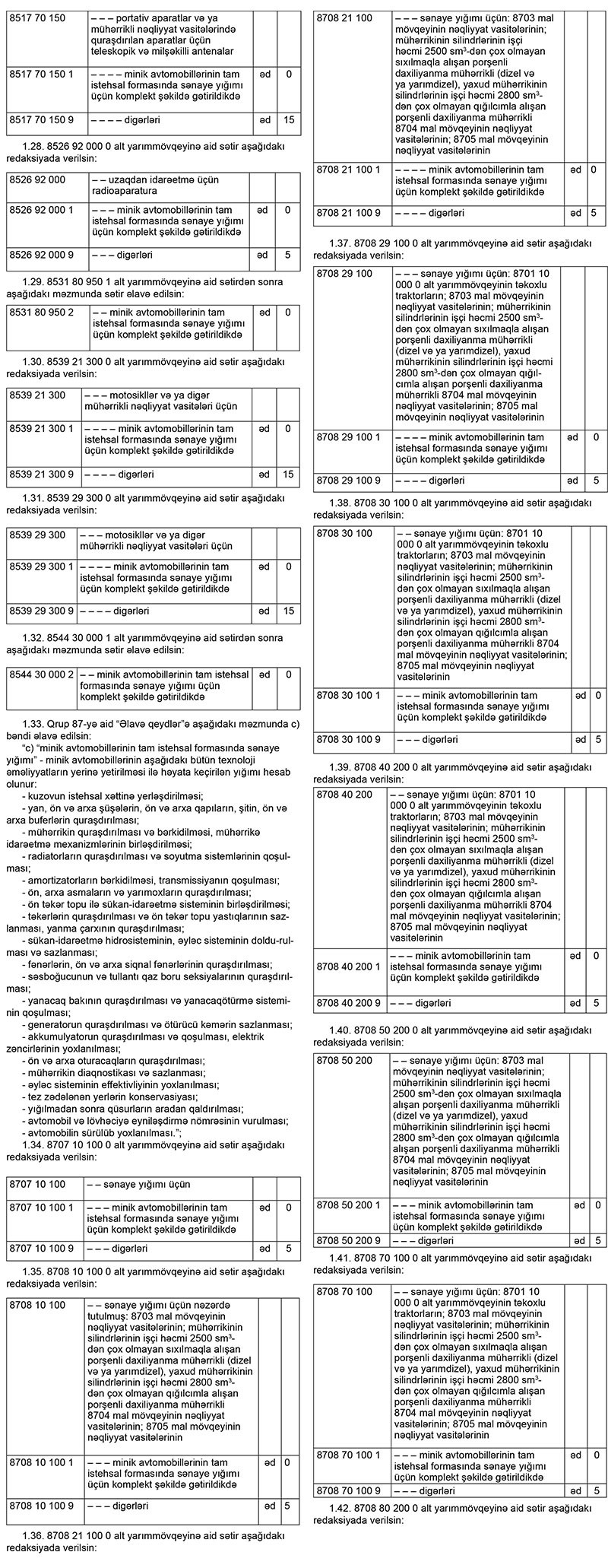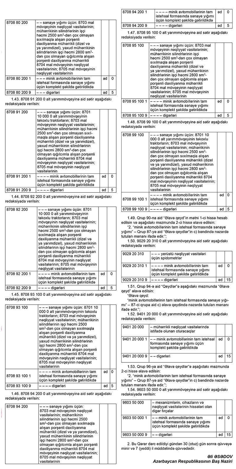 Digər avtomobillər üçün gətirilən detallar, ehtiyat hissələri üçün gömrük rüsumları qüvvədə saxlanılır.