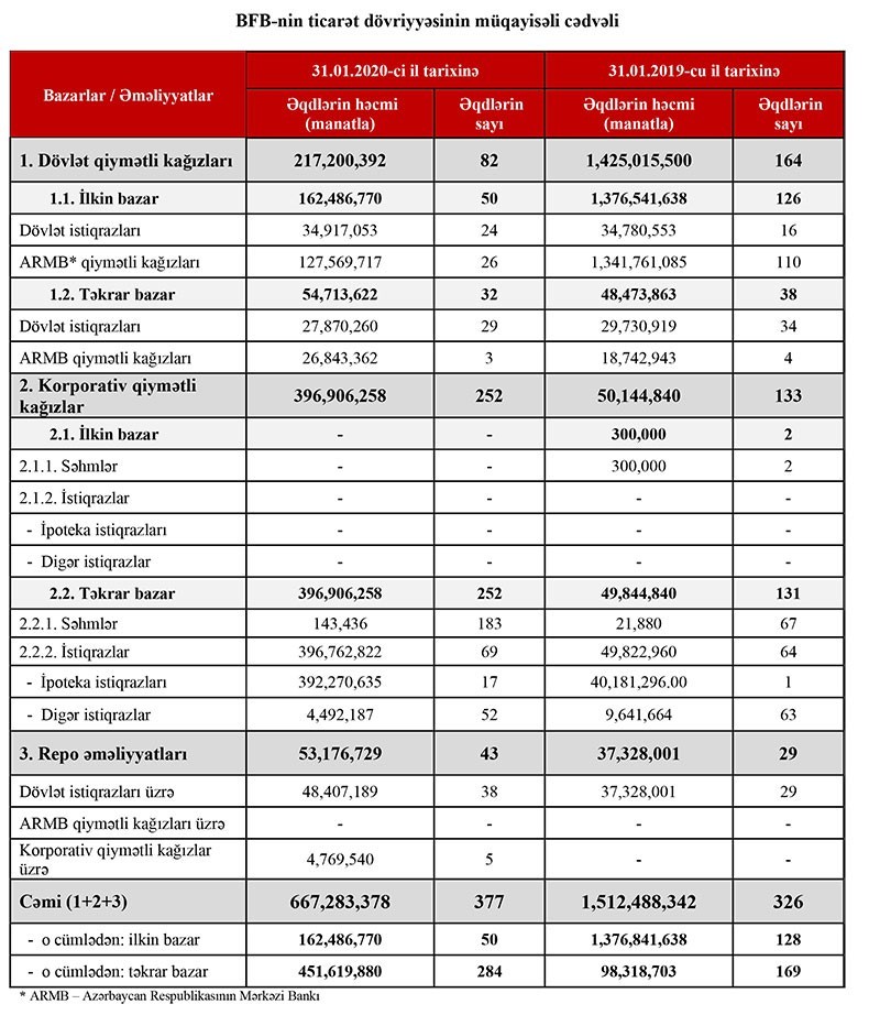 2020-ci ilin yanvar ayında ötən ilin eyni ayı ilə müqayisədə korportaiv qiymətli kağızlar bazarı təxminən 8 dəfə artaraq 396 milyon 906 min manat təşkil edib. Ötən il bu bazar üzrə cəmi əməliyyat həcmi 50 milyon 144 min manat təşkil etmişdi. Böyük artımın səbəbi ipoteka istiqrazlarının təkrar bazarında əməliyyatın həcminin 10 dəfəyə yaxın artaraq 40 milyon 181 min manatdan 392 milyon 270 min manatadır.