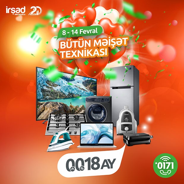 (®) İrşad Electronics Sevgililər Gününə özəl olaraq aksiyaya başlayır. 8 - 14 fevral tarixlərində şirkətin mağazalarından bütün telefonları ilkin ödənişsiz və faizsiz olmaqla 14 ay, bütün məişət texnikasını isə 18 ay hissə-hissə ödəmə şərti ilə əldə etmək mümkündür.