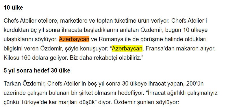 Əsasən otellər üçün şirniyyatlar (tartolet, kruvasan, cheesecake və makaron) istehsal edən Türkiyənin "Chefs Atelier" şikəti Azərbaycana ixrac üçün danışıqlar aparır.