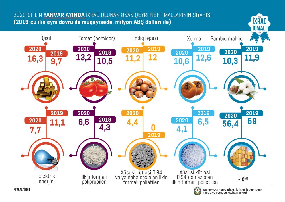 İcmalda qeyd edilib ki, 2020-ci ilin yanvar ayı ərzində ixrac edilən qeyri-neft sektoruna aid malların siyahısına qızıl (sikkə kəsilməsində istifadə olunmayan, digər emal olunmamış formalarda – 16,3 milyon ABŞ dolları) başçılıq edib. Bu siyahıda pomidor (13,2 milyon ABŞ dolları) ikinci və qabığı təmizlənmiş meşə fındığı (11,2 milyon ABŞ dolları) üçüncü olub.