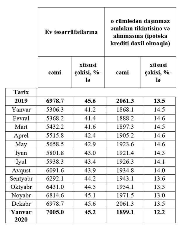 31 Yanvar 2020-ci il tarixində cəmi Ev təsərrüfatlarına kredit qoyuluşları 7 milyard 4 milyon 997 min manat təşkil edib. Bu rəqəm 2019-cu ilin sonunda 6 milyard 978 milyon 719 min manat idi. Qısası, yanvarda cəmi Ev təsərrüfatlarına kredit qoyuluşları 26 milyon 278 min manat artıb. Əgər daşınmaz əmlakın tikintisi və alınması üçün ev təsərrüfatlarına verilən kreditlər azalmasa idi artım daha böyük olardı.