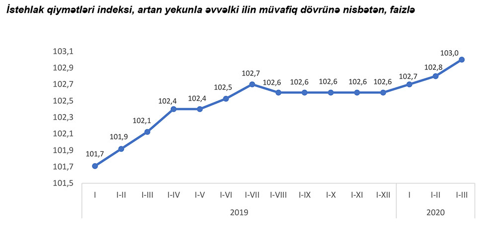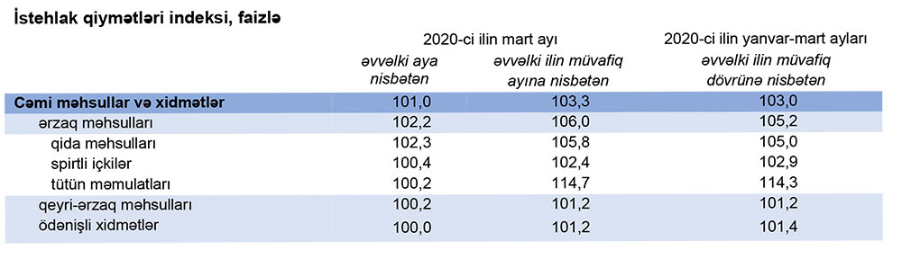 Azərbaycanda illik inflyasiya 3%, illik ərzaq inflyasiyası isə 6% təşkil edib2020-ci ilin yanvar-mart aylarında istehlak qiymətləri indeksi (inflyasiya) 2019-cu ilin yanvar-mart aylarına nisbətən 3 faiz, o cümlədən ərzaq məhsulları, içkilər və tütün məmulatları üzrə 5,2 faiz, qeyri-ərzaq məhsulları üzrə 1,2 faiz, əhaliyə göstərilmiş ödənişli xidmətlər üzrə 1,4 faiz təşkil edib.