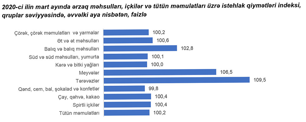 2020-ci ilin mart ayında ərzaq məhsulları, içkilər və tütün məmulatları üzrə istehlak qiymətləri indeksi əvvəlki aya nisbətən 2,2 faiz, əvvəlki ilin mart ayına nisbətən 6 faiz təşkil edib.